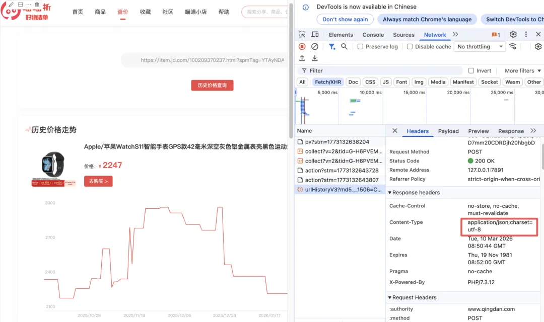 通过对网页查价过程的分析发现,页面的历史价格折线图实际上是由后台传回的JSON数据包动态渲染而成的。因此我们不需要去费力解析复杂的网页元素,而是可以直接利用监听功能来“截胡”这部分底层数据。实现起来也很简单,只需要在用代码模拟输入链接并点击“历史价格查询”按钮之前,提前开启针对该网站的网络监听。一旦程序捕获到后台返回的纯净字典格式数据包,我们就可以直接将里面的历史价格提取出来,完美避开了复杂的网页结构和各种反爬限制。最后我们将解析到的数据写入到csv文件中保存下来。