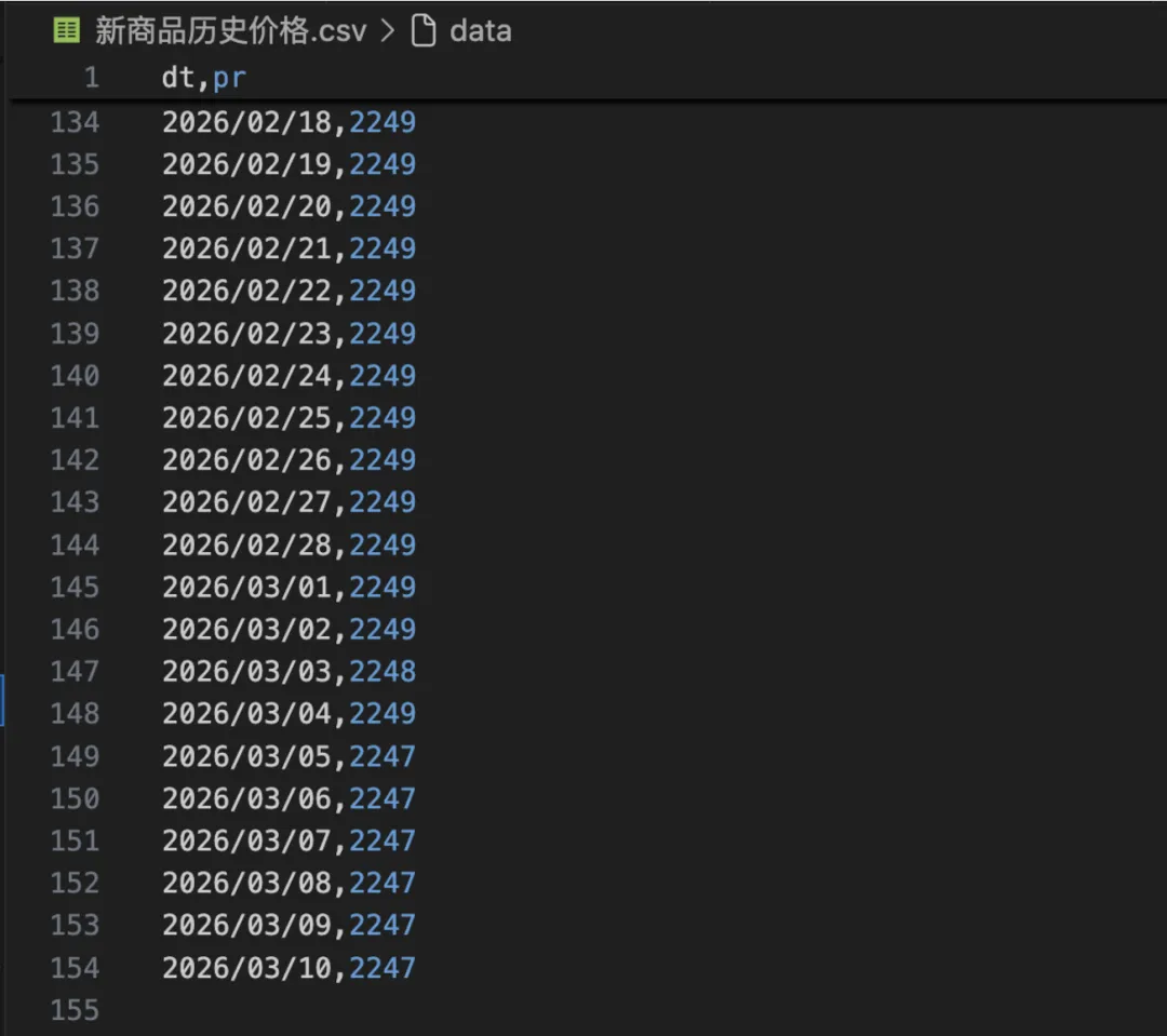# 准备要查询的商品链接(可替换)item_url = 'https://item.jd.com/100209370237.html?spmTag=YTAyNDAuYjAwMjQ5My5jMDAwMDQwMjcuMSUyM3NrdV9jYXJk'# 找到页面输入框并把新链接填进去page.ele('@placeholder^请输入商品链接').input(item_url)# 开启监听器page.listen.start('qingdan.com')# 定位并点击红色的“历史价格查询”按钮page.ele('text=历史价格查询').click()print(f"已开始查询新商品,正在拦截后台传回的数据包...")# 等待并抓取数据包for i in range(5):packet = page.listen.wait(timeout=3)if packet and 'application/json' in packet.response.headers.get('Content-Type', ''):# 将数据包转为Python字典data = packet.response.body# 提取带有日期的价格列表price_list = data['data']['pcinfo']['info']# 将提取出的列表写入CSV文件filename = '新商品历史价格.csv'with open(filename, 'w', encoding='utf-8', newline='') as fp:# 定义两列表头:dt(日期) 和 pr(价格)writer = csv.DictWriter(fp, fieldnames=['dt', 'pr'])writer.writeheader()# 遍历价格列表,写进表格for item in price_list:row_dict = {}row_dict['dt'] = item['dt']row_dict['pr'] = item['pr']writer.writerow(row_dict)break # 写入完成,跳出循环# 停止监听page.listen.stop()
