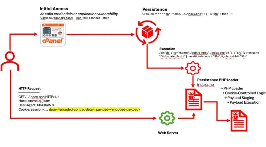 “攻击者并没有依赖复杂的漏洞利用链,而是利用环境中已有的合法执行路径,包括 Web 服务器进程、控制面板组件和 cron 基础设施,来部署和保存恶意代码。”
