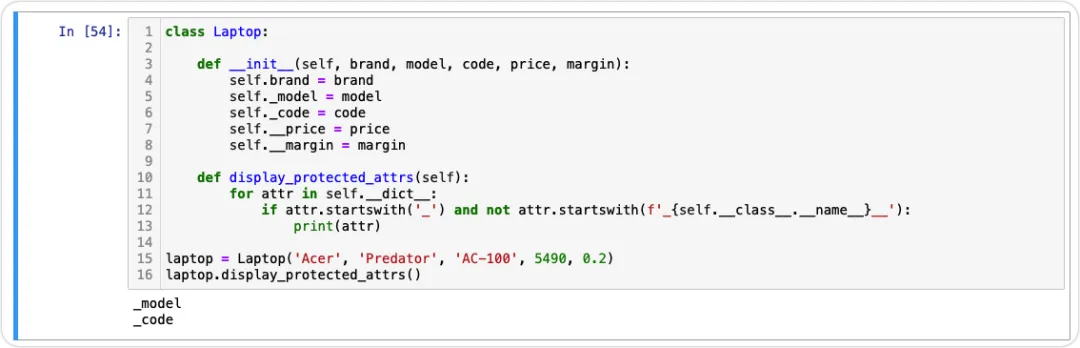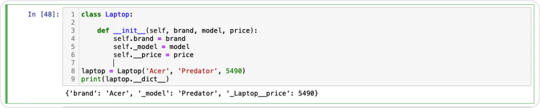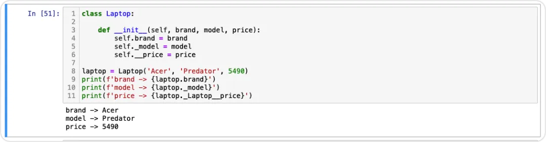 class Laptop: def __init__(self, brand, model, price): self.brand = brand self._model = model self.__price = pricelaptop = Laptop('Acer', 'Predator', 5490)