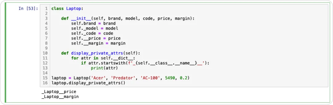 给出了Laptop类的实现。在Laptop类中实现一个名为display_private_attrs()的方法,该方法显示实例的所有私有属性名称。然后使用以下参数创建一个实例:并将其赋值给变量laptop。作为响应,在laptop实例上调用display_private_attrs()。_Laptop__price_Laptop__margin