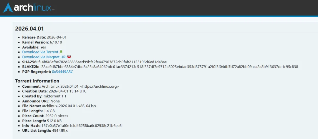 2026年4月,Arch Linux 发布了其最新的月度安装镜像 2026.04.01,这是典型的滚动发行(rolling release)体系下的“快照式发布”。该版本并非传统意义上的重大版本升级,而是对过去一个月(2026年3月)所有软件包更新的集中整合,主要面向新系统安装用户,确保安装后无需大量更新即可获得最新环境。