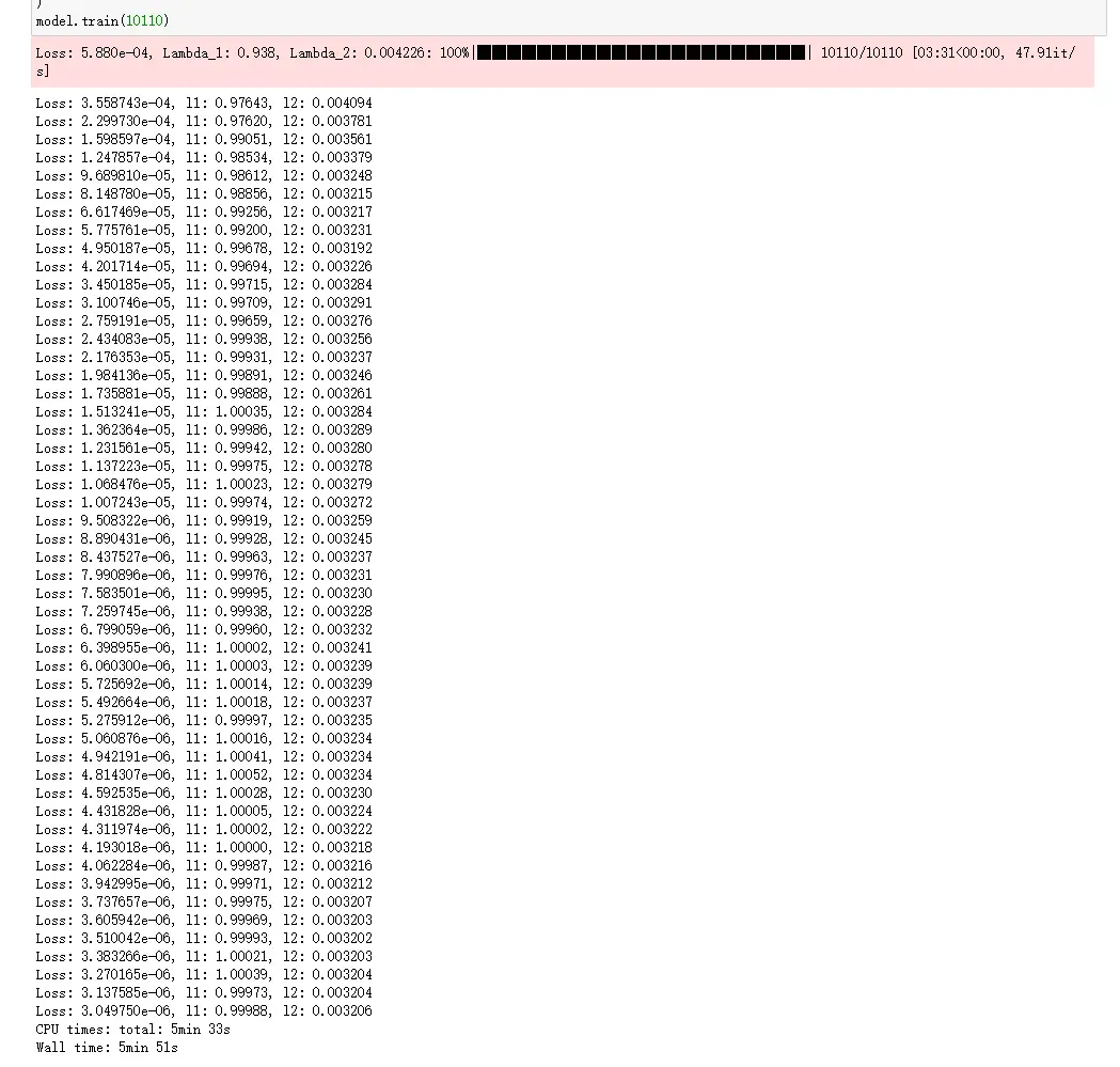 该模型实现了 “数据驱动 + 物理驱动” 的双约束机制,既保证拟合解与观测数据的一致性,又严格遵循 Burgers 方程的物理规律,从根源上提升参数反演的可靠性。