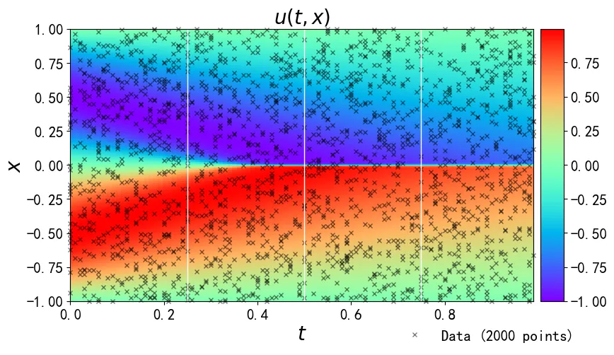 实验基于 PyTorch 深度学习框架开展,硬件环境支持 GPU 加速计算,软件环境配置适配的依赖库,保证模型高效运行。为验证模型有效性,生成不同参数下的 Burgers 方程标准解作为基准数据,模拟实际观测场景,添加不同强度的高斯噪声模拟噪声干扰,随机选取部分数据模拟稀疏观测场景。