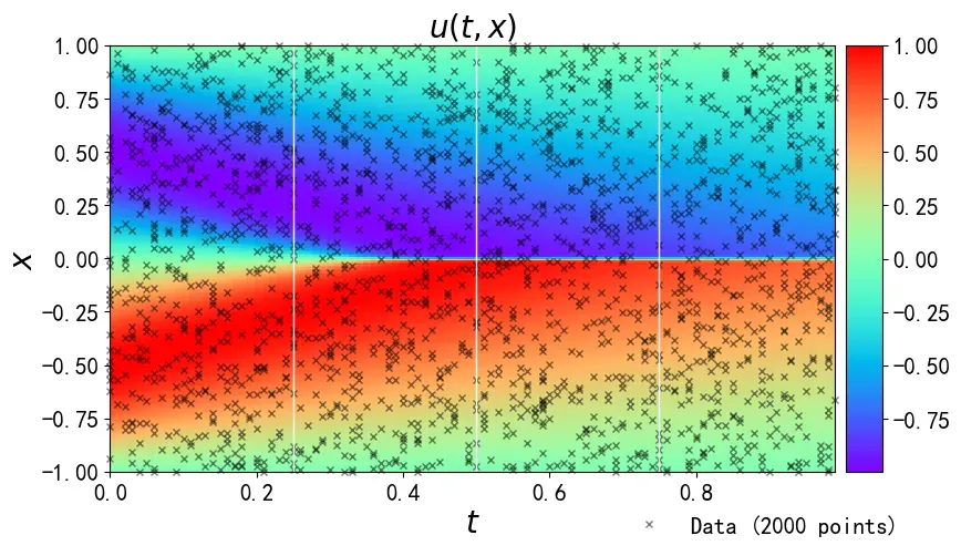 PyTorch 的动态计算图特性支持灵活的损失函数构建,可便捷地将 Burgers 方程、初始条件、边界条件转化为可微的损失项。模型中,未知参数以 PyTorch 张量形式定义,设置为可训练参数,与神经网络权重同步进行梯度下降优化。同时,PyTorch 支持 GPU 加速计算,能够大幅提升大规模数据下的训练效率,满足工程场景的实时性需求。