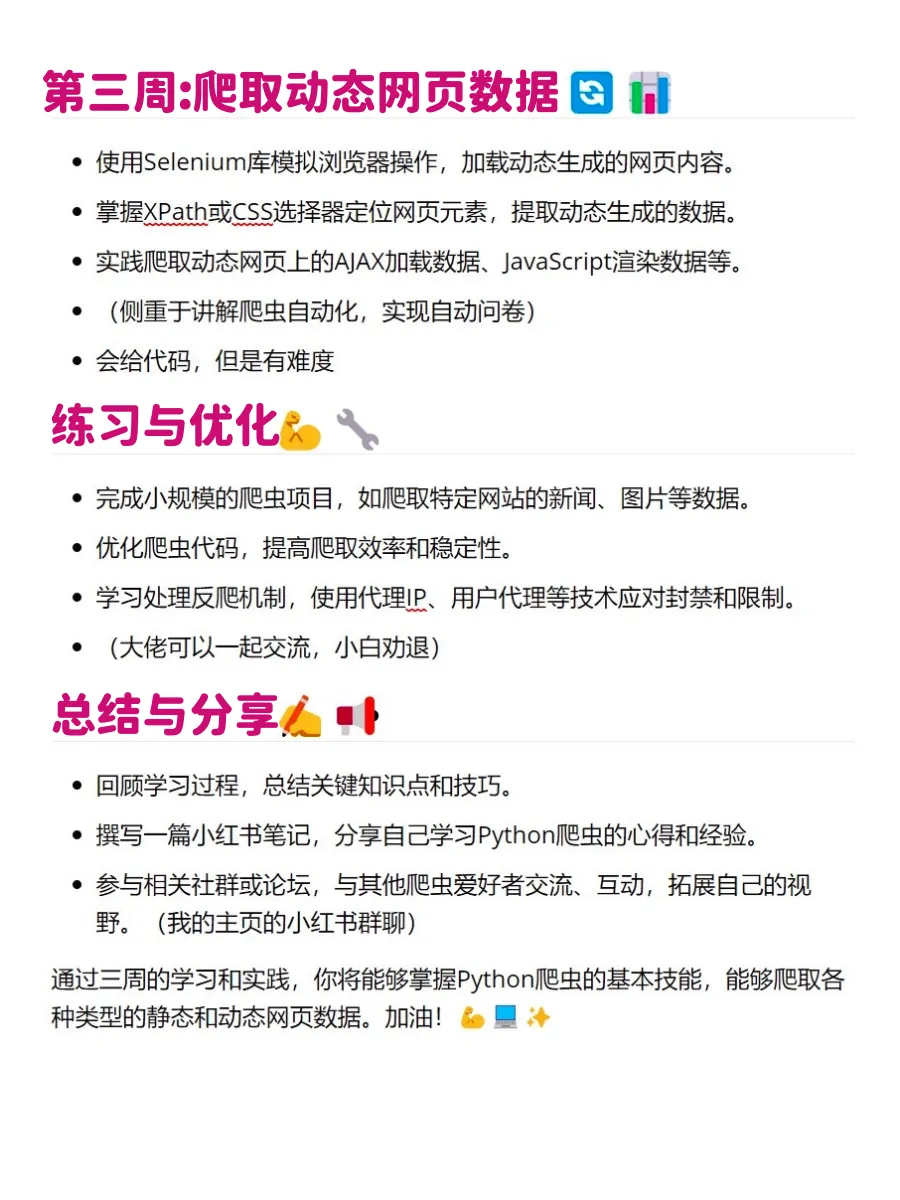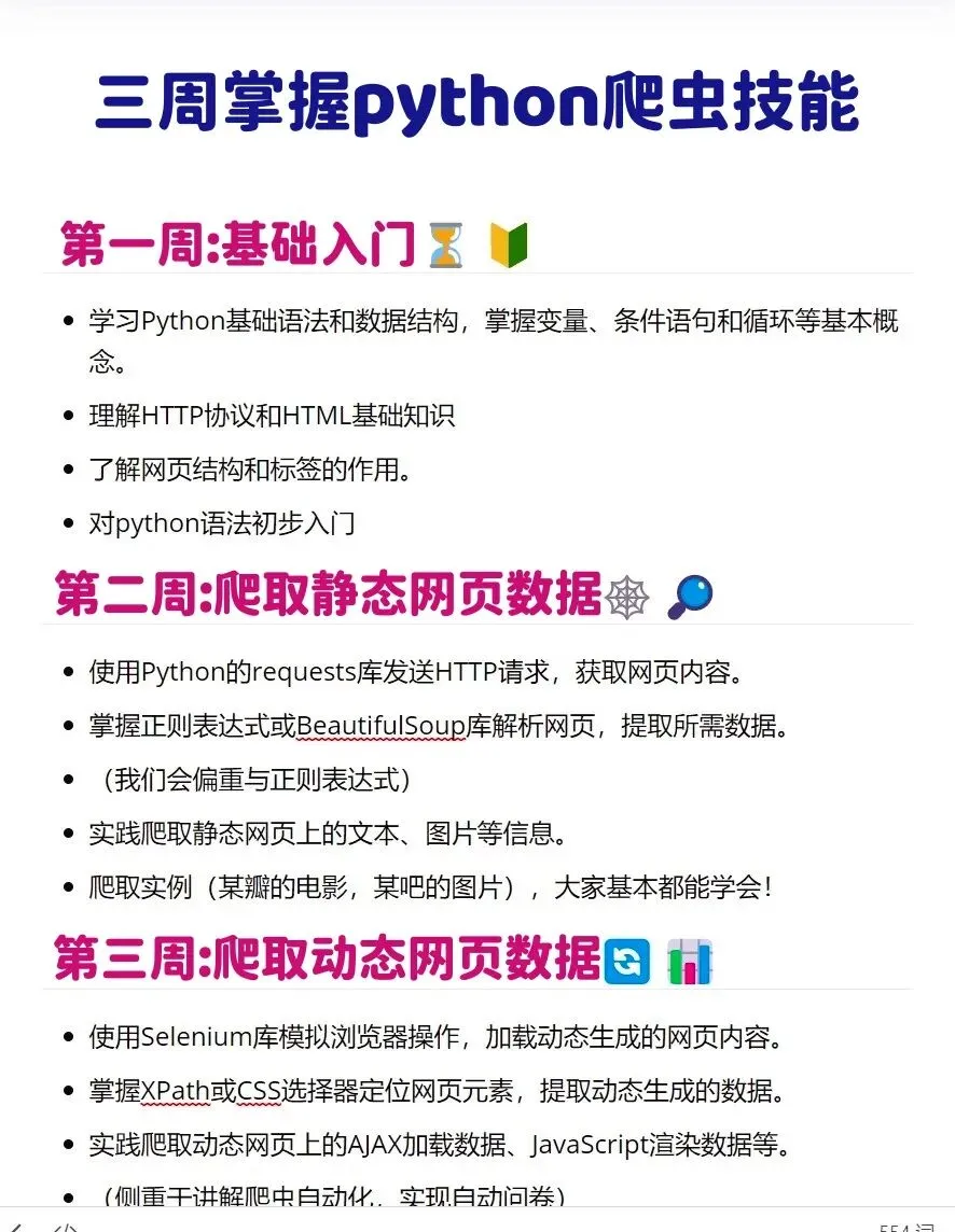今天给大家分享三周掌握Python爬虫技能,通过三周的学习和实践,你将能够掌握Python爬虫的基本技能,能够爬取各种类型的静态和动态网页数据。加油!