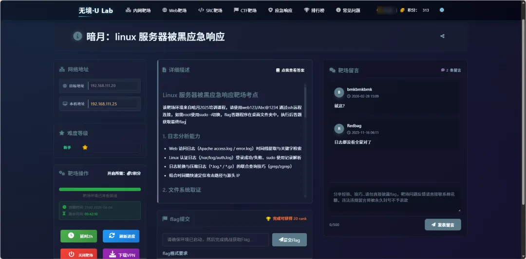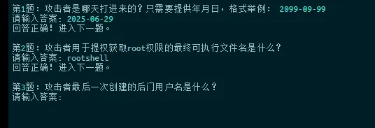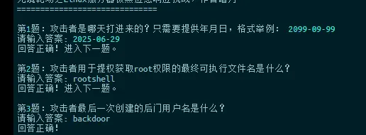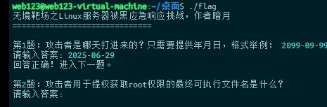 Linux 服务器被黑应急响应靶场考点该靶场环境来自暗月 2025 培训课程,请使用 web123/Abc@1234 通过 SSH 远程连接,如需 root 使用 sudo -i 切换。flag 答题程序在桌面文件夹中,执行后答题获取最终 flag。