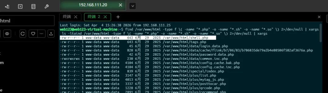 # 枚举 Web 目录中的 php / sh / so 文件,并按时间细看find /var/www/html -type f \( -name "*.php" -o -name "*.sh" -o -name "*.so" \) 2>/dev/null | xargs ls -lta