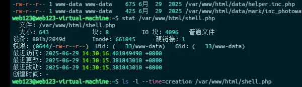 # 查看文件的精确时间戳stat /var/www/html/shell.php得到时间:2025-06-29 14:30:15
