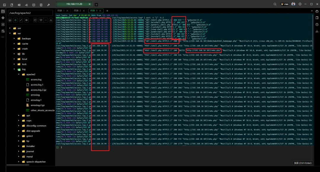 # zgrep 能同时搜普通日志和 .gz 压缩日志zgrep 'shell.php' /var/log/apache2/access.log*zgrep:能搜索 普通日志 + .gz 压缩日志access.log*:匹配所有 Apache 访问日志我自己平时更喜欢这个写法,按时间排一下,顺手很多: