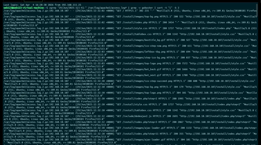 # 去掉明显的目录扫描流量,聚焦真实利用请求zgrep "29/Jun/2025:1[1-4]:" /var/log/apache2/access.log* | grep -v gobuster | sort -t "[" -k 2