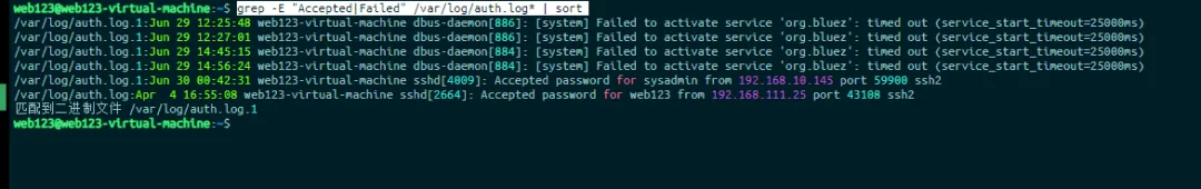 # 查看 SSH 成功/失败登录记录grep -E "Accepted|Failed" /var/log/auth.log* | sort