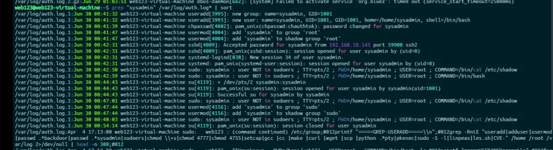 sysadmin 的行为# 追踪 sysadmin 在认证日志里的相关行为grep "sysadmin" /var/log/auth.log* | sort