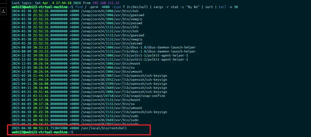 # 列出系统中的 SUID 文件,并按时间排序看最近异常项find / -perm -4000 -type f 2>/dev/null | xargs -r stat -c "%y %n" | sort | tail -n 30