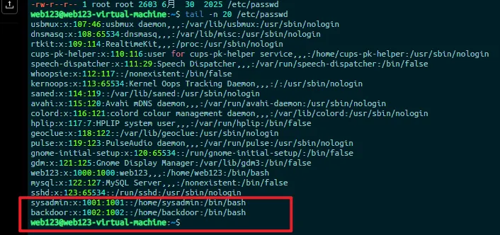 /var/log/auth.log.1:Jun 30 00:42:31 web123-virtual-machine sshd[4009]: Accepted password for sysadmin from 192.168.10.145 port 59900 ssh2发现 192.168.10.145 在 Jun 30 00:42:31 用 sysadmin 账户成功登录过。