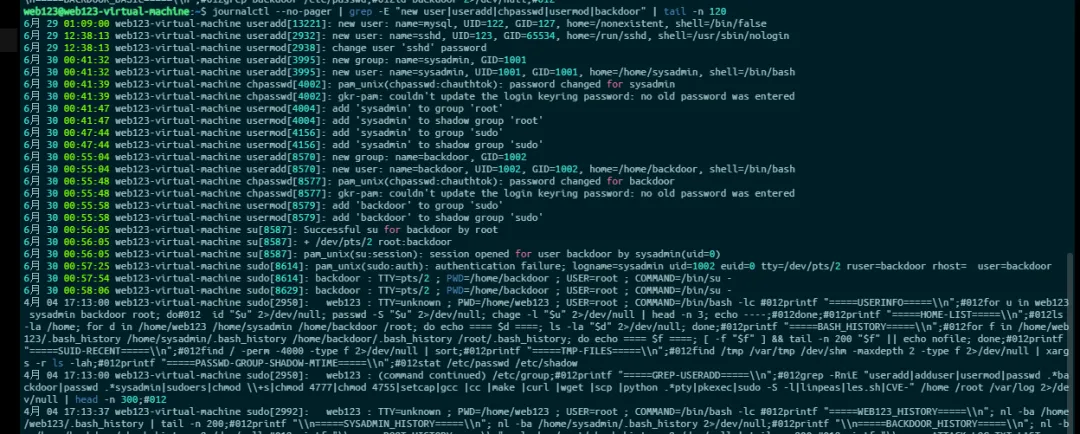 # 从 systemd/journal 日志里找创建账户、改密码、改组等动作journalctl --no-pager | grep -E "new user|useradd|chpasswd|usermod|backdoor" | tail -n 120