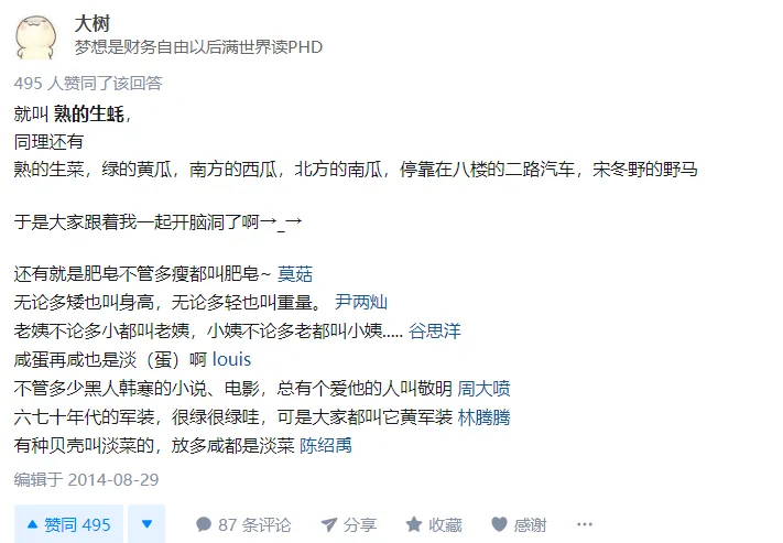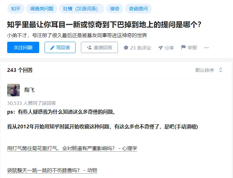 听起来是不是很复杂,实际上最终还是通过90%10%的数据+10%90%的主观来进行了排名,为大家精选了15个最为“沙雕”的问题,也选取部分网友的回答,问问题的操作诚然很风骚,面对这些“沙雕”问题,认真回答的绝对是风骚PLUS,特此声明,以下回答来自于知乎网友: