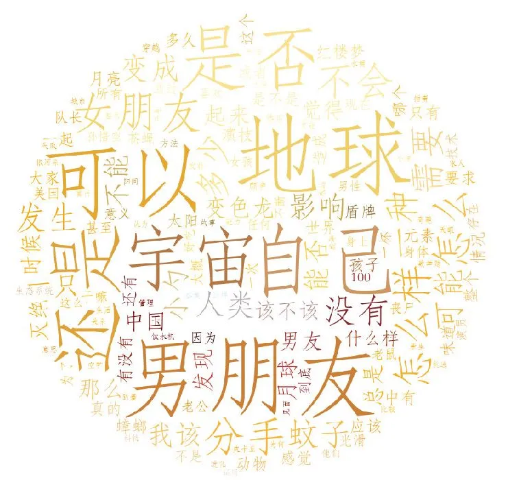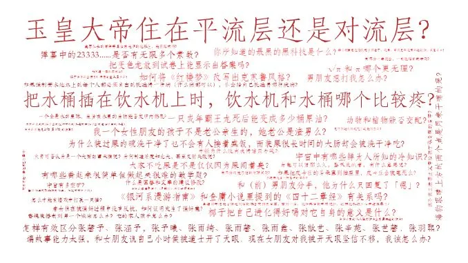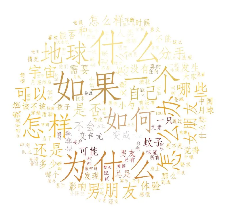 在分享出最终的“沙雕排行榜”前,我们首先严肃认真(lixinggongshi)的进行一波分析,主要看一下问题中的关键词,首先是所有词云的词云:
