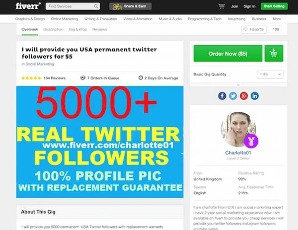 核心目标是创建一个分类器来识别哪些账号是属于Twitter机器人的,我是通过监督学习来实现的。“监督”意味着我们需要已有标注的样本数据。例如,在最开始的时候,我们需要知道哪些账号属于机器人,哪些账号属于人类。在过去的研究中,这个费力不讨好的任务已经被研究生的使用(和滥用)完成了。例如:Jajodia 等人通过手动检测账号,并且运用Twitter版本的图灵检测来判断一个账号是否属于机器人,判断推文是否由机器人发布的。问题是我已经不再是个研究生了并且时间宝贵(开玩笑)。我解决了这个问题多亏我的朋友兼同事Jim Vallandingham 提出的绝妙建议,他向我推荐了fiverr,一个花5美元就能获取各类奇特服务的网站。