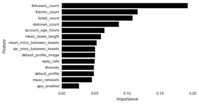 啊哈,更加精确了!简单的调试步骤产生了一个新格局,预测的准确率提高了2%。为调试过的随机森林检查变量重要性策略产生了一些惊喜。朋友数量和粉丝数量是机器人识别中最重要的变量。