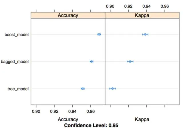 但是,我认为R语言中caret包最大的特点是能够容易地比较不同的模型。使用 resamples 函数,可以很快地生成可视化效果来比较我选择的指标模型的性能。这种类型的效用函数在建模过程中是超级有用的,也让你在不想花费大量时间来制作图的终稿的时候可以就早期的结果进行交流。