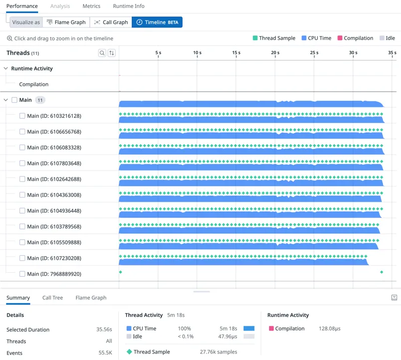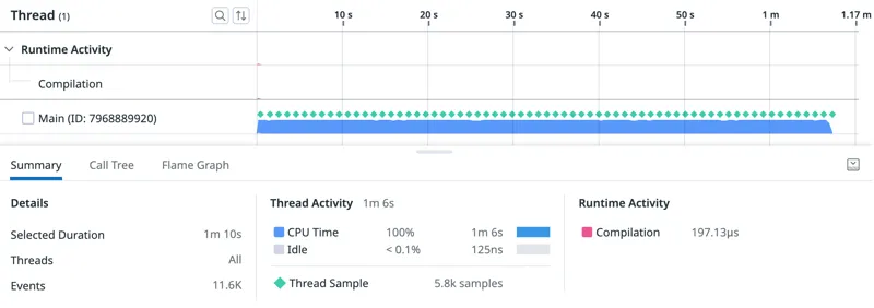 可视化的时间轴帮助我看到了,明显是 CPU 限制了速度,脚本开头的文件编译可以忽略不计,并且也没有垃圾收集事件。
