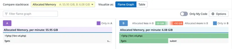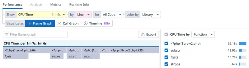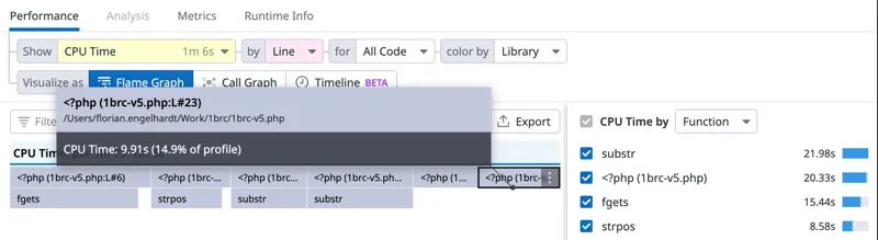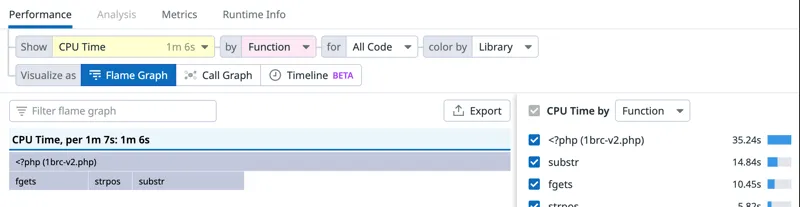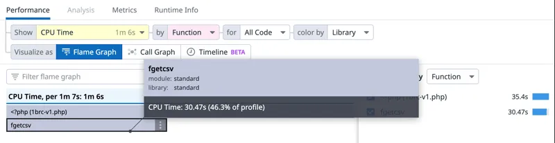 火焰视图,显示了fgetcsv()函数上的瓶颈。