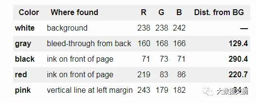 从表中可以看出,笔记反面渗过来的深灰色应该被分为背景色,但它与白色背景的差值要比粉红色的差值更大,而粉红色应该是前景色。如果使用这种方法,就无法有效分离出粉红色的前景色,因为总会包含渗过来的深灰色。