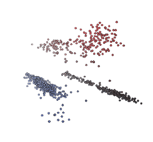 为了实现这个目标,我们通过数据驱动的方式,也就是利用上图中的“簇状”特性,选择每个色簇的中心坐标来表示这一组颜色。用术语说,我们将通过聚类分析来解决一个色彩量化问题(其实是向量量化)。