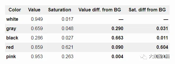 下表展示了每种颜色与背景色的欧几里德距离: