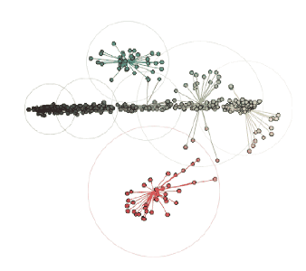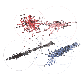在这张图中,黑色轮廓彩色实心的点表示前景色像素的颜色坐标,通过彩色的线将它们连接到RGB色彩空间中最近的中心点。当图像转换为索引颜色时,每个前景色像素的颜色将被替换为距其最近的中心点的颜色。最后,包围每个颜色簇的圆表示每个中心点距相关像素的最远距离。