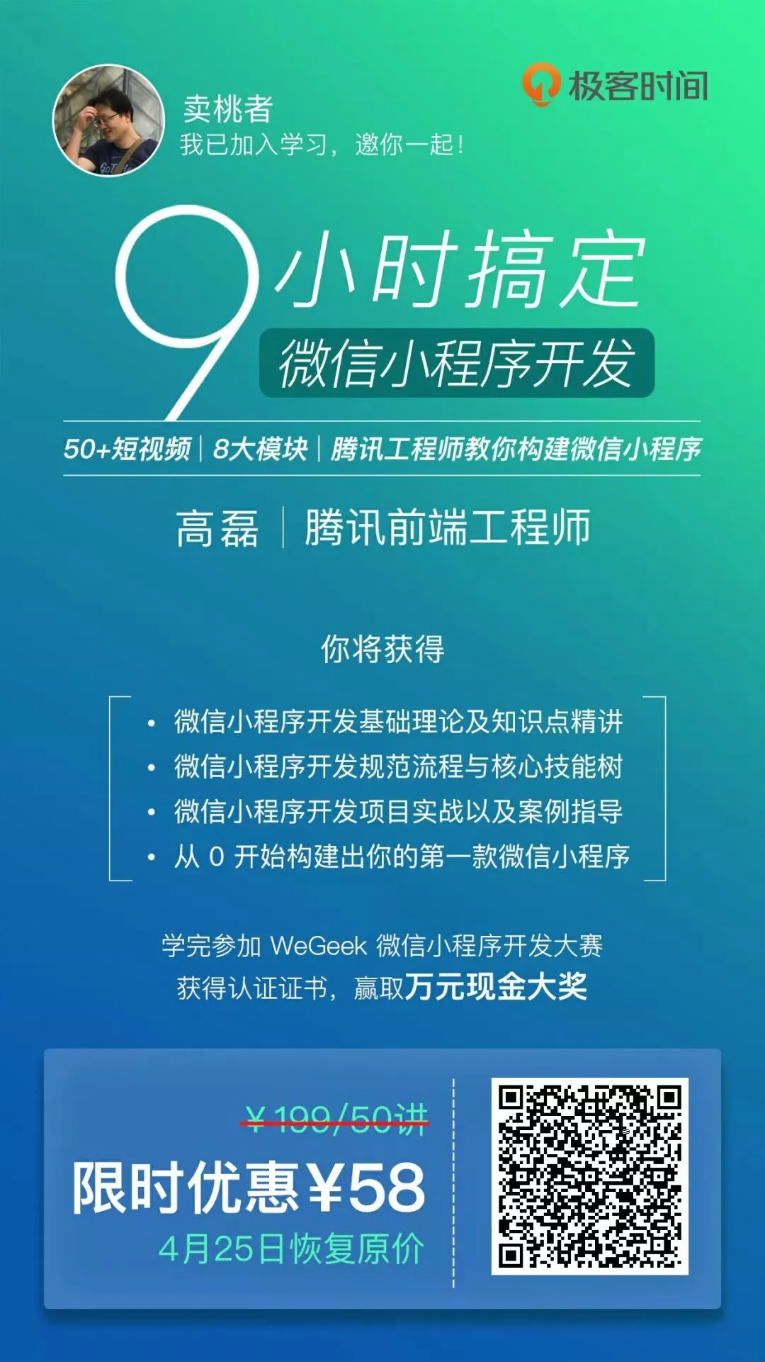 我们和腾讯工程师合作推出了《9 小时搞定微信小程序开发》课程,以期帮助更多的人搭上时代快车,不要错过下一个可能的创富机会。腾讯工程师将为用户带来更为体系化的核心知识讲解,并教会你更加规范化的开发流程和理念。