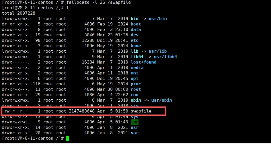 swap一般建议大小和物理内存相等,我们服务器内存是2G,所以使用下面命令在根目录下创建一个2G的缓存文件: