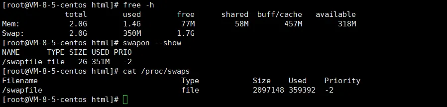 free -h # 查看内存swapon --show # 查看Swapcat /proc/swaps # 查看Swap详细信息