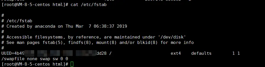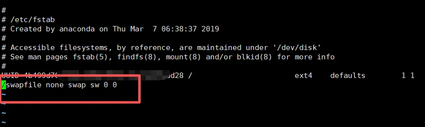 通过下面命令在/etc/fstab文件中添加Swap配置,可以开机自动加载: