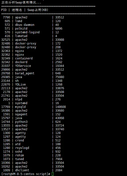 可以看到mysql、java、docker等程序都有部分数据被放到了Swap中,如果访问请求中正好使用到了在swap中的数据,那么响应速度就有可能从毫秒级变成了几十秒了,这就很影响用户体验了。