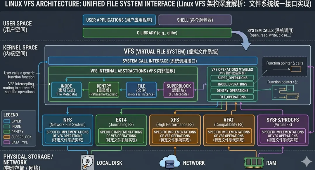 Linux 操作系统的成功很大程度上归功于其强大的抽象能力,而虚拟文件系统(Virtual File System, VFS)正是这种能力的集中体现。在早期的计算环境中,不同的硬件存储介质和文件格式(如 FAT、Ext2、NFS)拥有截然不同的访问逻辑,如果让应用程序直接处理这些差异,软件的兼容性将成为一场灾难。VFS 的核心哲学在于“万物皆文件”,它在内核态构建了一个中间层,为用户层屏蔽了底层物理介质的差异。这种设计的本质是面向对象思想在 C 语言中的极致应用,通过定义一组标准的数据结构和操作接口(如 read, write, open),无论底层是高速固态硬盘上的本地文件,还是通过网络传输的远程数据,亦或是存在于内存中的伪文件系统(如 procfs),对于用户程序而言,它们在表现形式上都是统一的文件描述符。