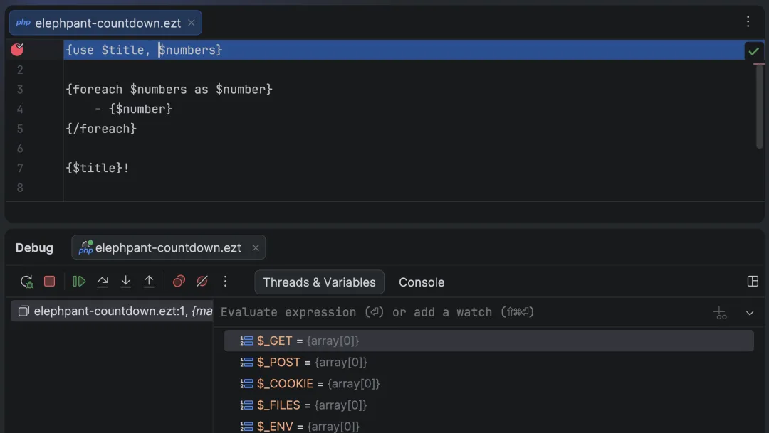现在,只要在 IDE 设置中将文件名模式与 PHP 文件类型相关联,便可在非 PHP 文件中设置断点。结合 Xdebug 3.5 中引入的模板与编译 PHP 文件之间的原生路径映射,此功能允许您调试任何格式的源模板文件,包括像 .ezt 这样的小众扩展程序。