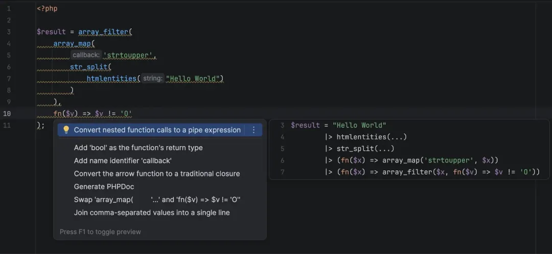 PhpStorm 现在能够检测可以使用 PHP 8.5 管道运算符语法的代码元素,并提供快速修复建议,将此类代码转换为更易读的管道运算符链。