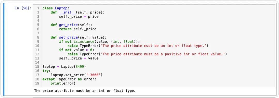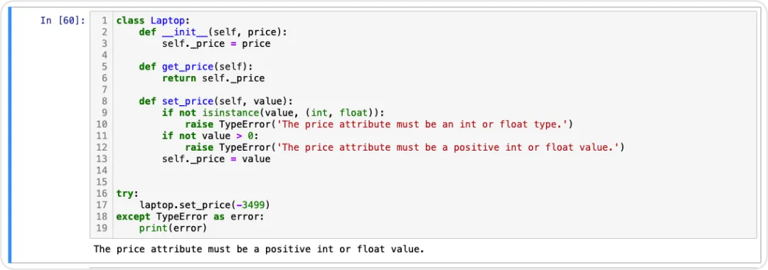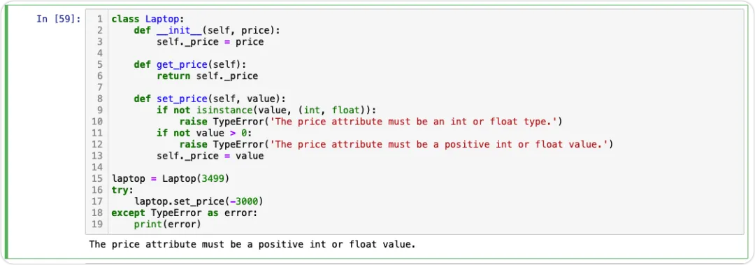 class Laptop: def __init__(self, price): self._price = price def get_price(self): return self._price def set_price(self, value): if not isinstance(value, (int, float)): raise TypeError('The price attribute must be an int or float type.') if not value > 0: raise ValueError('The price attribute must be a positive int or ' 'float value.') self._price = value