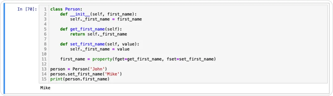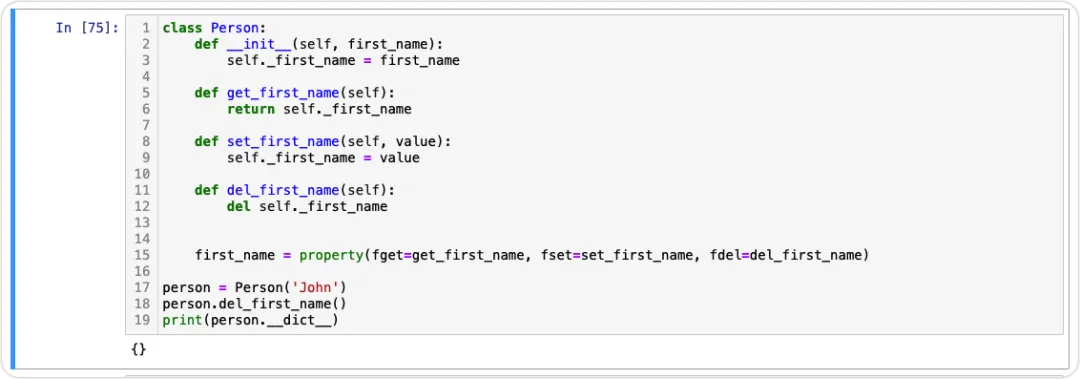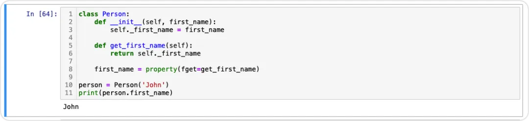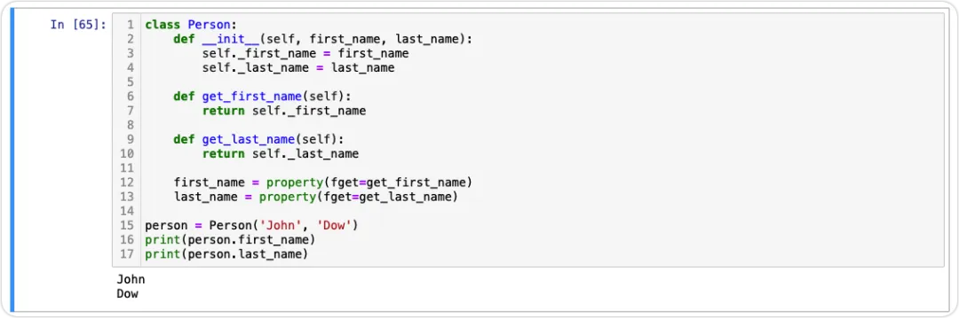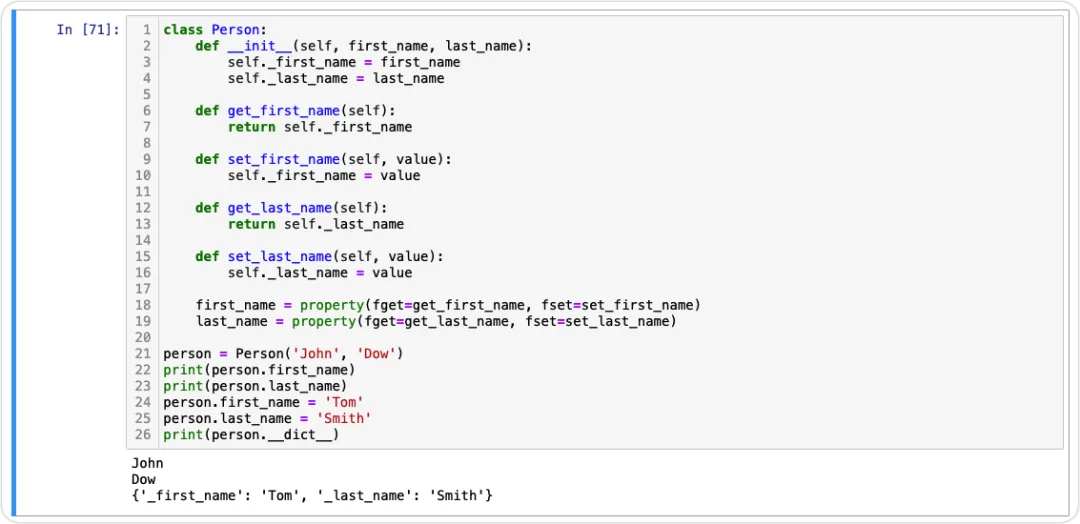 class Person: def __init__(self, first_name, last_name): self._first_name = first_name self._last_name = last_name def get_first_name(self): return self._first_name def set_first_name(self, value): self._first_name = value def get_last_name(self): return self._last_name def set_last_name(self, value): self._last_name = value first_name = property(fget=get_first_name, fset=set_first_name) last_name = property(fget=get_last_name, fset=set_last_name)person = Person('John', 'Dow')print(person.first_name)print(person.last_name)person.first_name = 'Tom'person.last_name = 'Smith'print(person.__dict__)