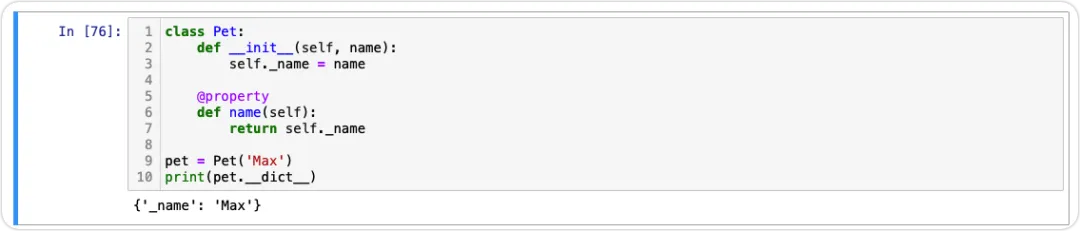 实现一个名为Pet的类,该类有一个受保护的实例属性name。然后实现一个name()方法,用于读取受保护的name属性的值。使用@property装饰器创建一个name属性(只读)。创建Pet类的一个名为pet的实例,并将name属性设置为'Max'。作为响应,打印该实例的__dict__属性内容。练习65
