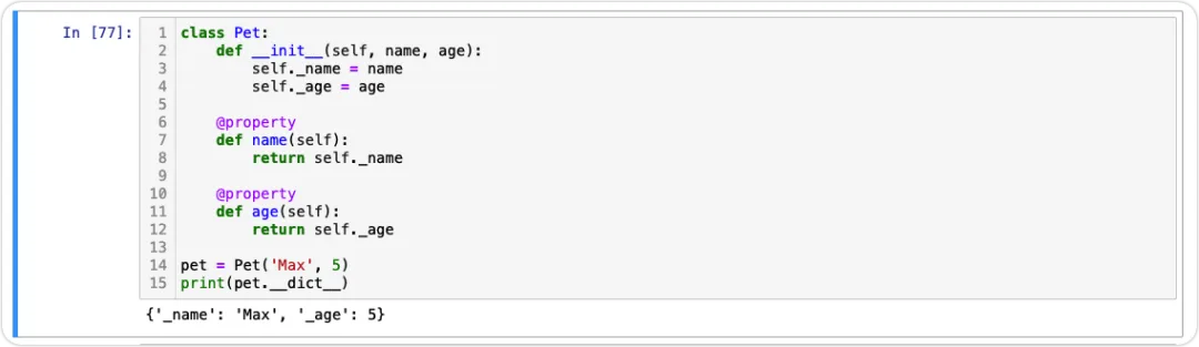 实现一个名为Pet的类,该类有两个受保护的实例属性:name和age。接下来实现name()和age()方法,分别读取受保护的name和age属性的值。使用@property装饰器分别创建name和age属性(只读属性)。创建Pet类的一个名为pet的实例,并将name属性设置为'Max',age设置为5。作为响应,将pet实例的__dict__属性内容打印到控制台。{'_name': 'Max', '_age': 5}