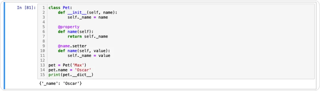 实现一个名为Pet的类,该类有一个受保护的实例属性name。然后,使用@property装饰器创建一个name属性(用于读取和修改,不进行验证)。创建Pet类的一个名为pet的实例,并将name属性设置为'Max'。然后,使用点符号将name属性的值修改为'Oscar'。练习67