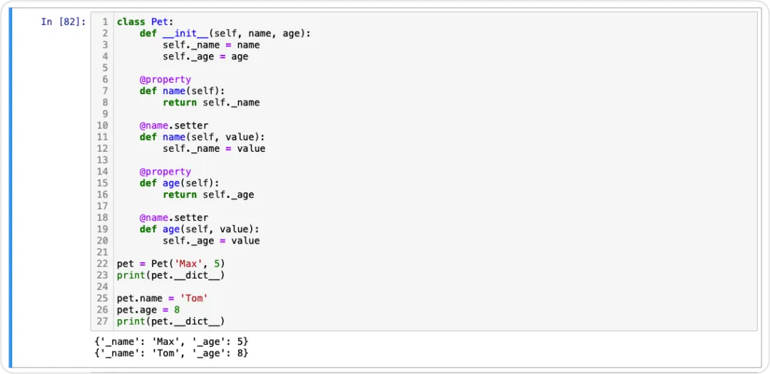 class Pet: def __init__(self, name, age): self._name = name self._age = age @property def name(self): return self._name @name.setter def name(self, value): self._name = value @property def age(self): return self._age @age.setter def age(self, value): self._age = value