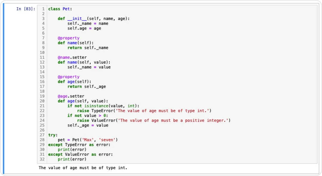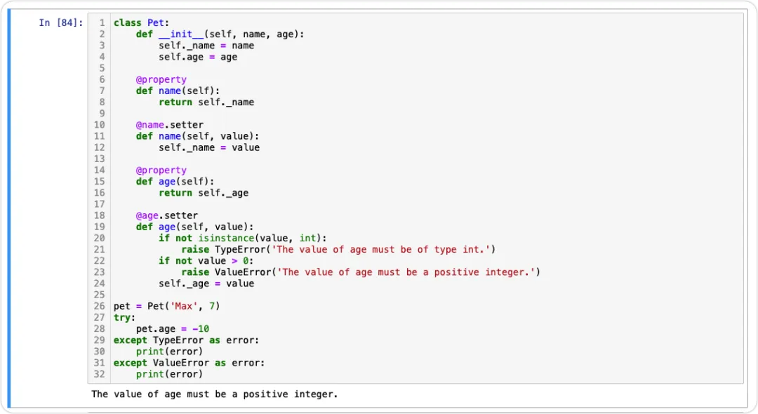 class Pet: def __init__(self, name, age): self._name = name self.age = age @property def name(self): return self._name @name.setter def name(self, value): self._name = value @property def age(self): return self._age @age.setter def age(self, value): if not isinstance(value, int): raise TypeError('The value of age must be of type int.') if not value > 0: raise ValueError('The value of age must be a positive integer.') self._age = valuepet = Pet('Max', 7)try: pet.age = -10except TypeError as error: print(error)except ValueError as error: print(error)