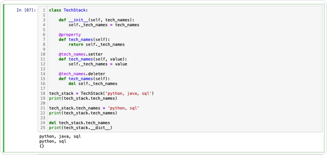 实现一个名为TechStack的类,该类有一个受保护的实例属性tech_names。然后,使用@property装饰器创建一个tech_names属性(读取、修改和删除属性,不进行验证)。创建该类的一个名为tech_stack的实例,并设置tech_names属性值:打印tech_names属性的内容。然后,将此属性修改为值:删除tech_stack实例的tech_names属性。将tech_stack实例的__dict__属性内容打印到控制台。python,java,sqlpython,sql{}