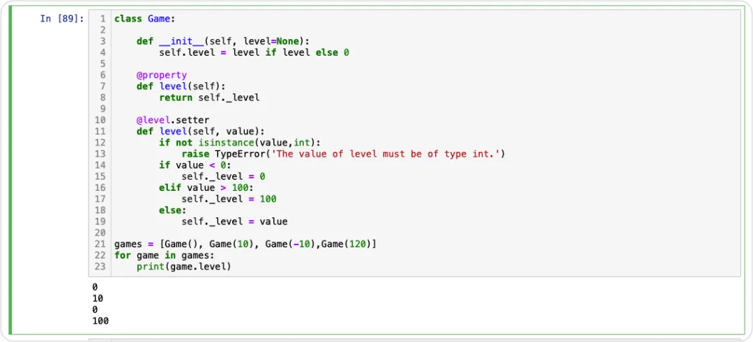 实现一个名为Game的类,该类有一个名为level的属性(读取和修改属性,默认为0)。level属性的值应该是[0, 100]范围内的整数。在实例创建和属性修改阶段添加验证。如果值不是int类型,引发TypeError并显示以下消息:'The value of level must be of type int.'