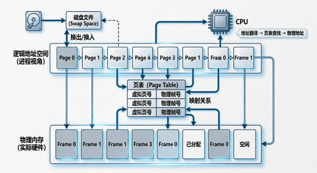 如果页面已分配但不在内存中,内核则需从交换设备读取页面内容并加载至内存。无论何种情况,缺页异常处理完成后,内核都会更新页表项中的相关信息,如设置页面存在位、权限位以及页面帧号等,以确保后续内存访问能够正确命中有效的映射项 3。这种动态更新机制不仅保证了内存管理的连贯性,还为操作系统提供了灵活的内存分配与回收策略。