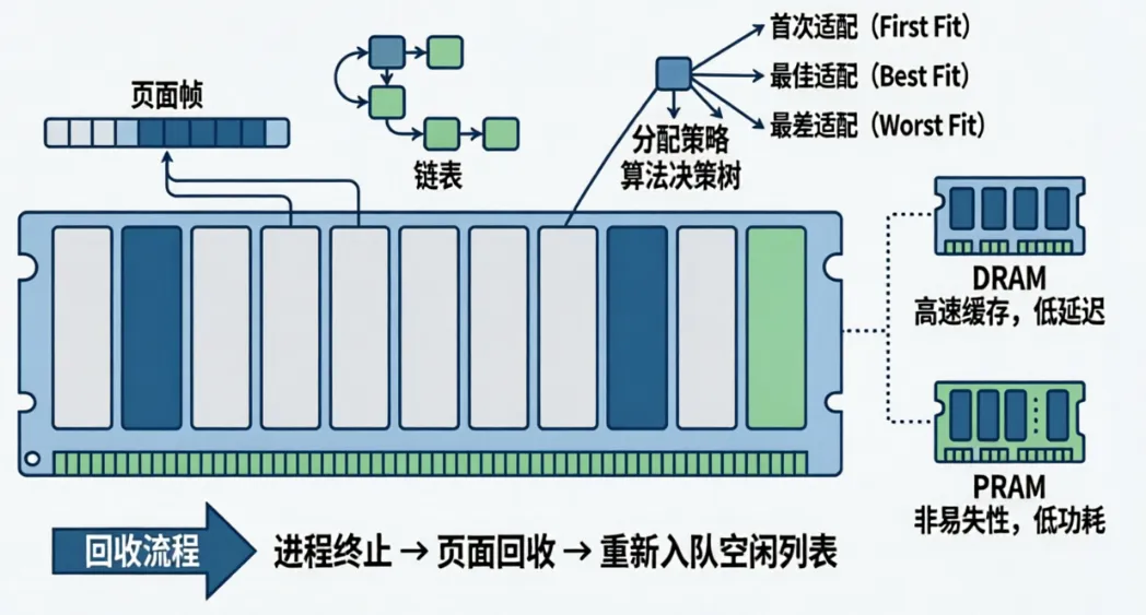 值得注意的是,现代 Linux 内核还结合了混合内存架构的设计理念,例如利用相变存储器(PRAM)与动态随机存储器(DRAM)共同组成主内存,以进一步优化内存性能和功耗。这种多层次的内存管理方式为复杂应用场景提供了更好的支持。